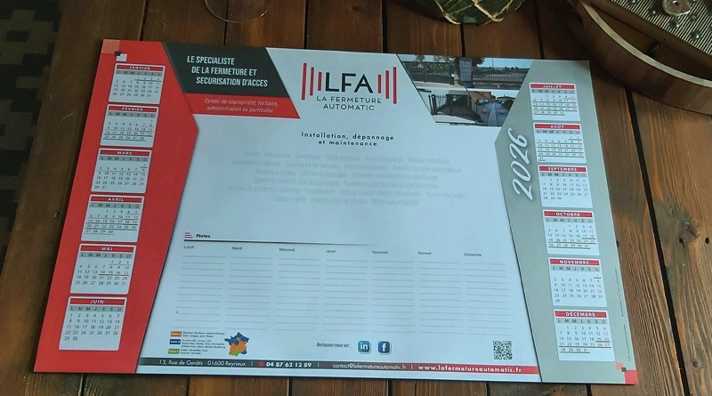 Création et impression de 50 blocs sous-mains 25 feuillets personnalisé avec calendrier 2026 pour notre client La Fermeture Automatic.